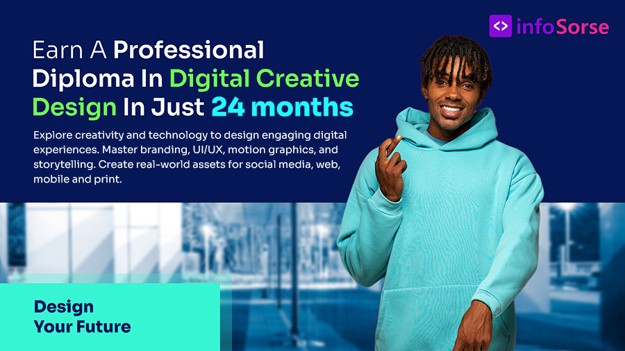 The 24-month Professional Diploma in Digital Creative Design at InfoSorse offers a comprehensive and immersive learning experience designed to equip learners with the creative and technical skills needed to thrive in the fast-evolving world of digital design. With flexible enrollment options—including fully online (weekday or weekend), recorded self-paced study, on-campus, or workplace training—students can choose the mode that best fits their schedule while benefiting from live mentorship by seasoned creative professionals and industry experts.