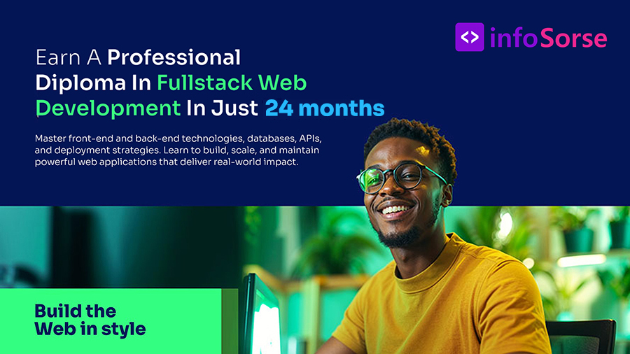 The 24-month Professional Diploma in Fullstack Web Development at InfoSorse offers a comprehensive and immersive learning experience designed to equip learners with the skills and knowledge needed to excel in the dynamic field of web application development. With flexible enrollment options—including fully online (weekday or weekend), recorded self-paced study, on-campus, or workplace training—students can choose the mode that best fits their schedule while benefiting from live mentorship by industry experts.